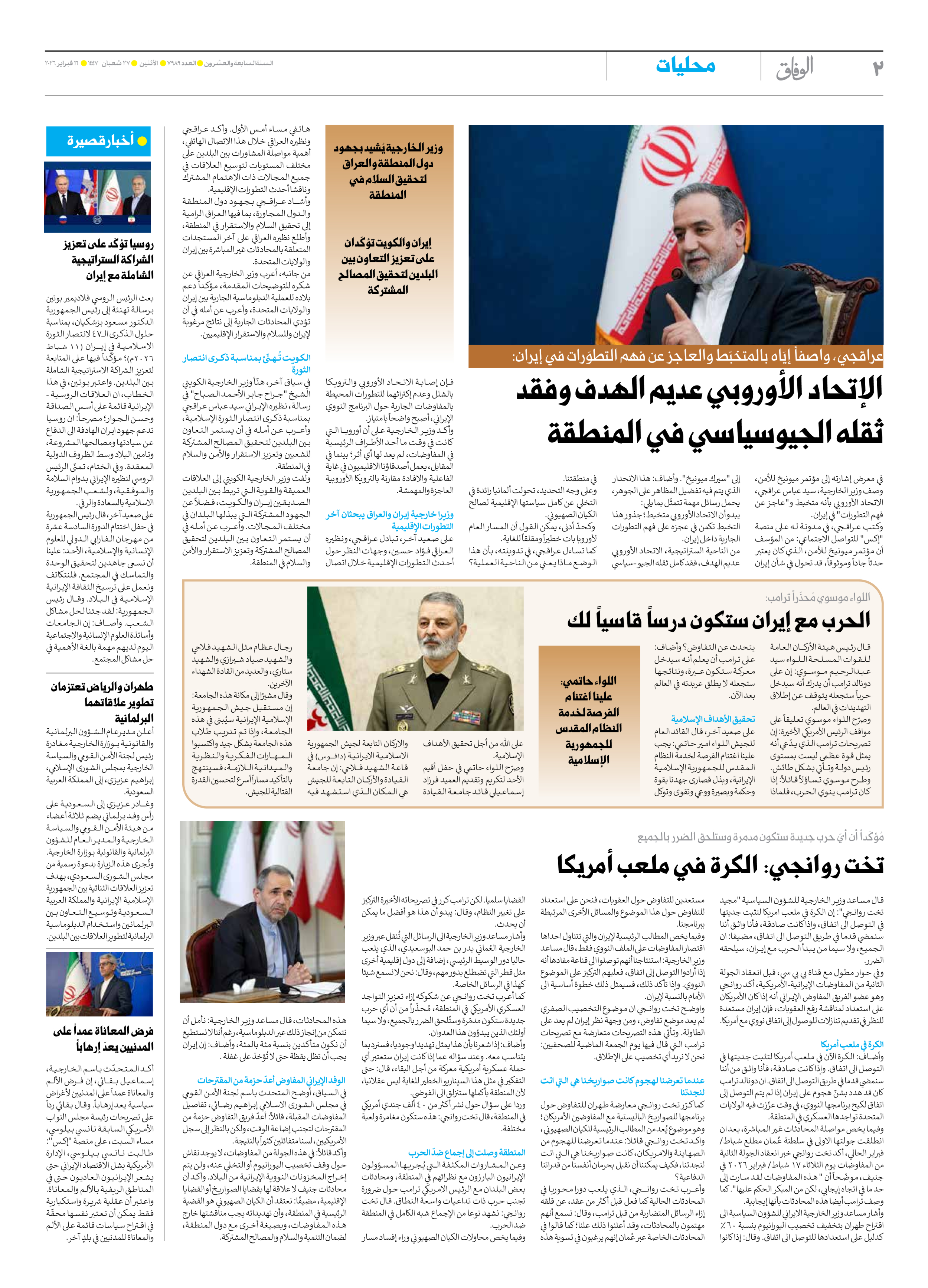 صحیفة ایران الدولیة الوفاق - العدد سبعة آلاف وتسعمائة وتسعة وثمانون - ١٦ فبراير ٢٠٢٦ - الصفحة ۲